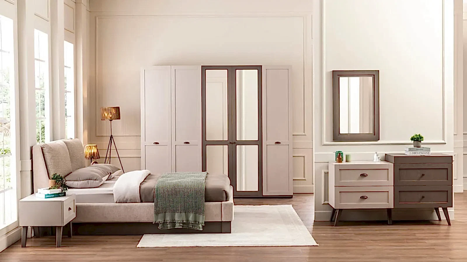 HERA yatak odası takımı, estetik ve işlevselliği bir araya getiren özel bir tasarıma sahiptir. Farklı materyallerin uyum içinde birleştiği bu takım, her decor tarzına uygun bir seçenek sunuyor. İçerik, yatak, başlık, komodin, dolap ve geniş bir aynadan oluşarak, yaşam alanınızı genişletici bir derinlik katıyor.