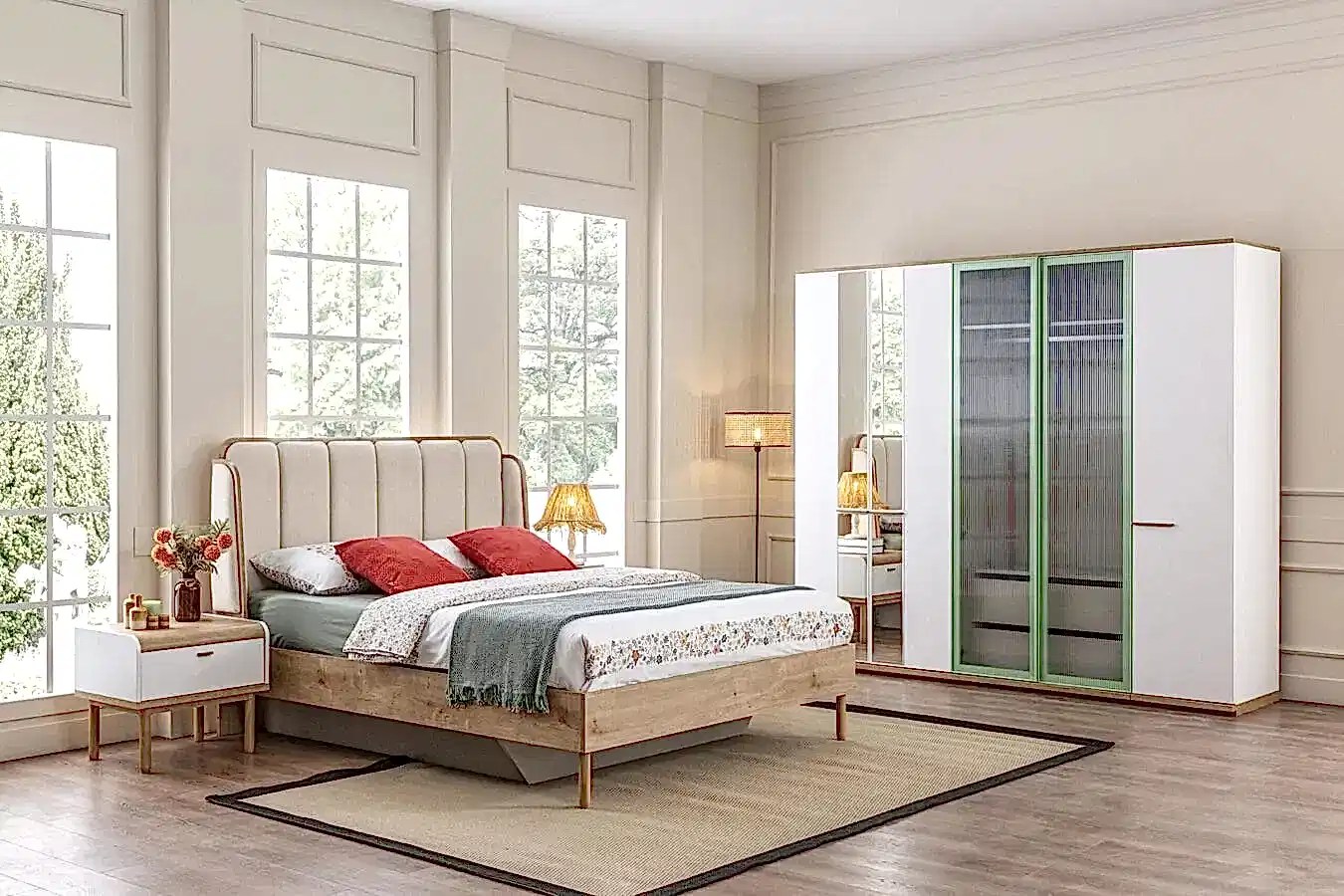 - Yatak, komodin, gardırop ve şifonyer gibi parçaları içerir.
