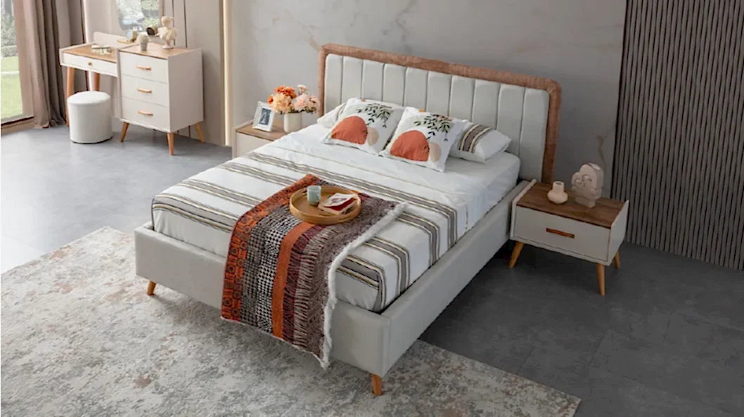 – Başlık: Yatak başlığı, takımın estetik görünümünü tamamlar. Farklı renk ve desen seçenekleri ile kullanıcıların zevkine hitap eder. Buna ek olarak, yumuşak dokusu sayesinde arkasında oturmaktan keyif alabilirsiniz.