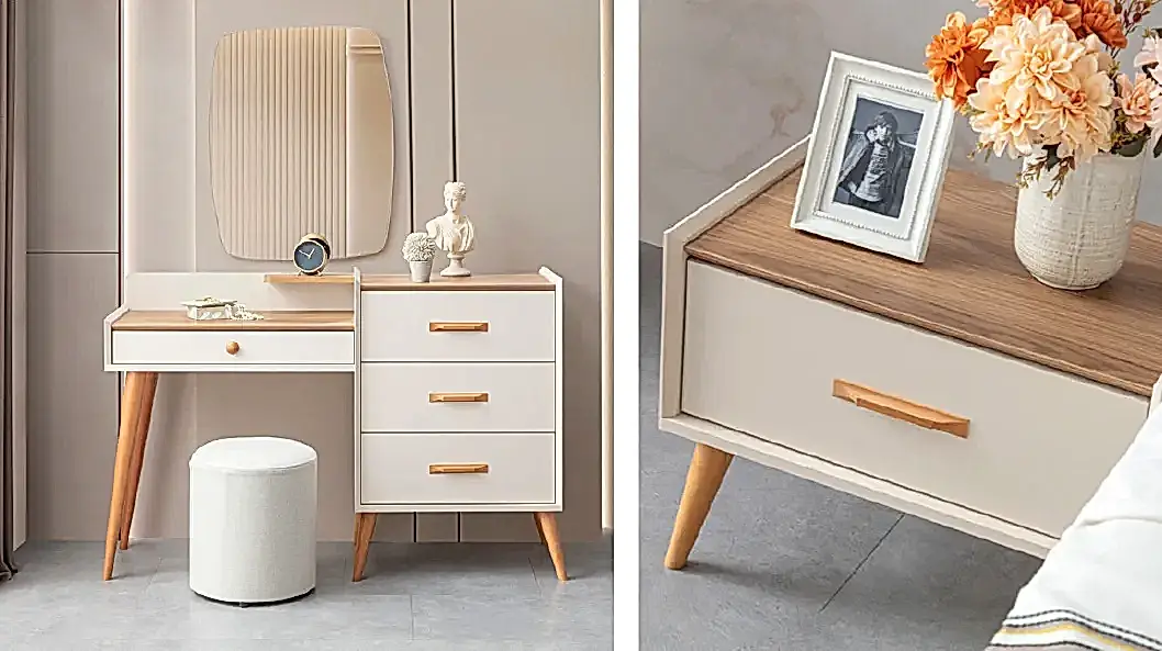 – Giyinme Masası: Takım, şık bir giyinme masası ile tamamlanır. Aynası ve geniş raf alanı sayesinde, makyaj yaparken veya kendinize düzenli şekilde bakarken ihtiyaçlarınızı karşılar.